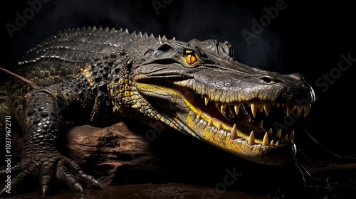 © Thanthara, Fototapeta premium Yellow eyed crocodile in the dark, scales and teeth exposed