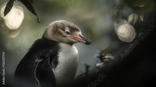 Naklejka premium Yellow-eyed penguin chick in foliage.