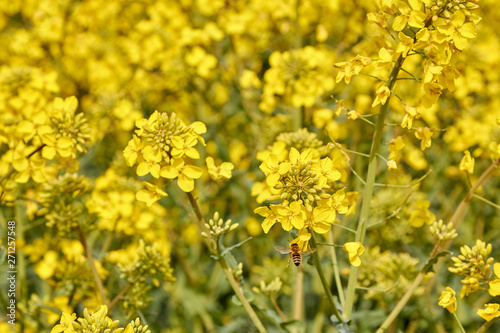 © jteivans, Fototapeta premium yellow field during rapeseed bloom at the end of May, bee pollinating flowers