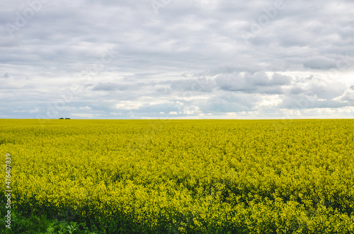 Fototapeta premium Yellow field rape flowers with blue sky and white clouds. Growing rapeseed for sale