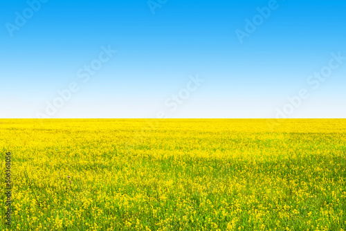 Obraz premium Yellow field rapeseed and clear blue sky