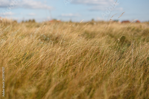 Obraz premium Yellow field. Sunset landscape. Dry grass field. Autumn landscape. Field flowers. Dry grass as background