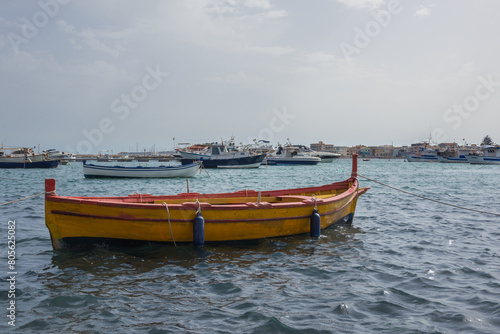 © Fotokon, Naklejka premium Yellow fishing boat in port of Marzamemi village on the island of Sicily, Italy