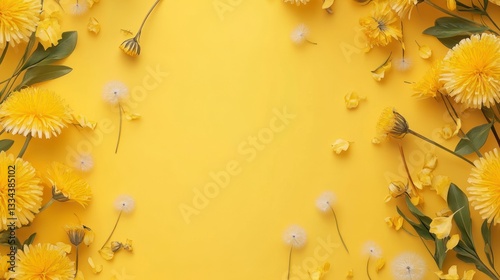 Fototapeta premium Yellow Floral Frame with Dandelions and Green Leaves on Yellow Background