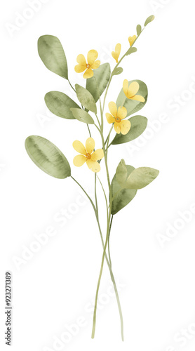 Obraz premium Yellow flower and leaves set, floral watercolor digital illustration for...
