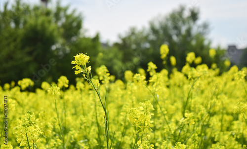 © Ks_GRBZ, Obraz premium yellow flower closeup on a background of green trees