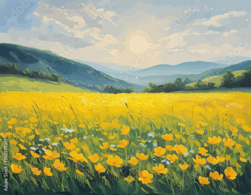 © TTh, Obraz premium Yellow Flower Field with Mountain View