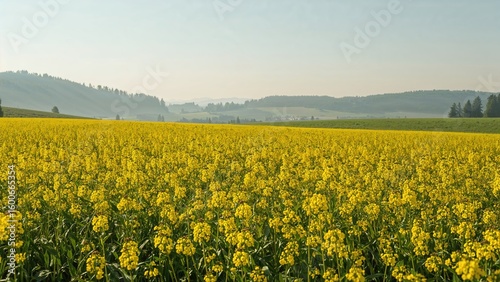 Obraz premium Yellow flowering rapeseed crops in a rural area