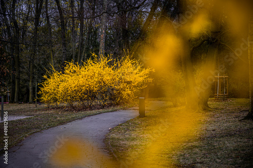 © Bokehed, Obraz premium Yellow flowering shrub Forsythia, otherwise called golden rain.