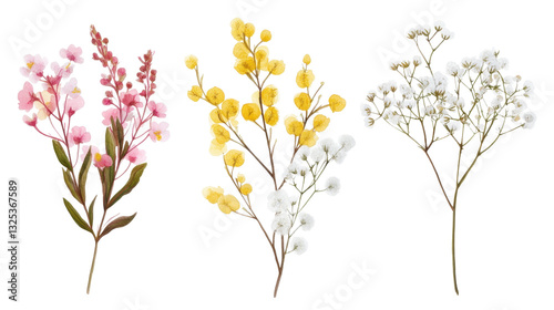 © ddaremmth, Obraz premium Yellow flowers and golden wheat isolated on a white background