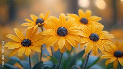 © Fridocha, Fototapeta premium Yellow flowers blooming in a garden with blurred background