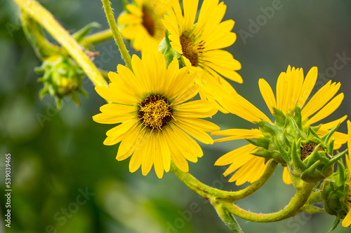 © barmalini, Fototapeta premium Yellow flowers heads of Silphium laciniatum or compass plant growing in garden