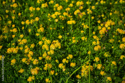 Fototapeta premium Yellow flowers on green soft focus meadow background.