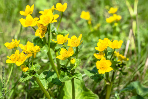 Obraz premium Yellow flowers on spring meadow, marsh marigolds blooming on wetlands