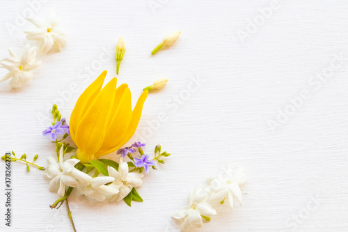 Naklejka premium yellow flowers ylang ylang ,white flower jasmine and purple flowers local flora of asia arrangement flat lay postcard style on background white wooden