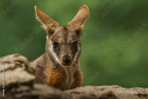 © Honza123, Fototapeta premium Yellow-footed rock-wallaby behind a rock. Closeup portrait.