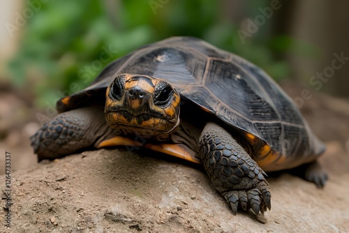 © Kopi_std, Fototapeta premium Yellow-footed tortoise resting on rock, garden background, nature wildlife photography