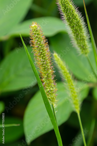 © Oleh Marchak, Naklejka premium Yellow foxtail grass blooms in a lush green setting during a sunny day in a natural habitat