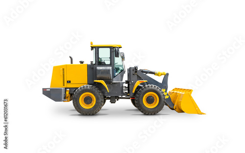 © gargantiopa, Fototapeta premium Yellow Front Wheel Loader Isolated on White Background. Manufacturing Equipment. Pneumatic Truck. Tractor Front End Loader. Heavy Equipment Machine. Side View Industrial Vehicle.