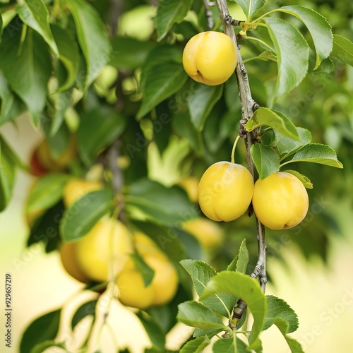 © Lupu, Obraz premium yellow fruit plum on the branch with green leaves closeup