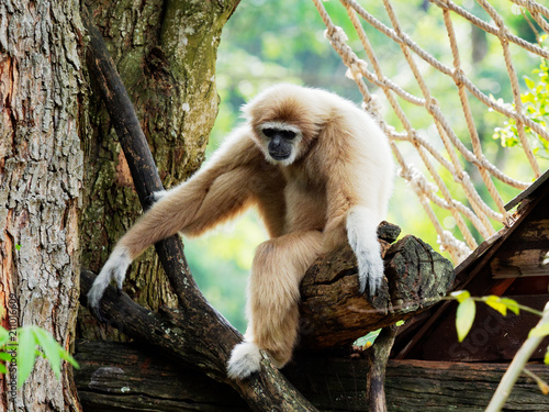 © PattayaPhotography, Naklejka premium Yellow gibbon with black face and white fur at eyebrow, cheek, hands, and feet resting on a log with blurred background