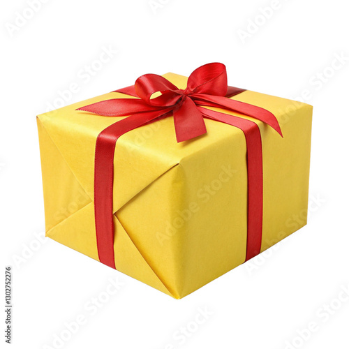 Obraz premium Yellow gift box with red ribbon isolated on transparent background...