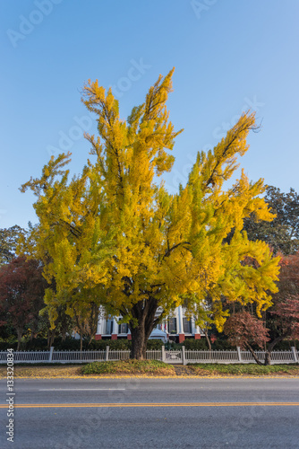 Naklejka premium Yellow Ginkgo Tree in front of Southern Mansion