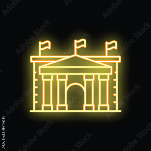 © ylivdesign, Obraz premium Yellow glowing neon sign representing a parliament building with flags, on a black background
