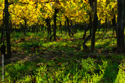Obraz premium yellow grape leaves and green grass in october sunny vinery