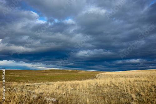 Fototapeta premium Yellow grass field under dramatic sky in Eastern Oregon in summer.