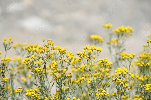 Fototapeta premium Yellow Grass Flowers field with Blurred mountain background at Leh Ladakh ,...