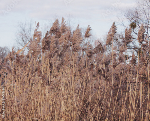 © Яна Михайловская, Fototapeta premium Yellow grass sways in the wind against a blue sky.