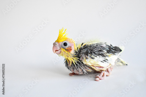 Fototapeta premium Yellow gray parakeet nymhpa chick baby close-up on white background
