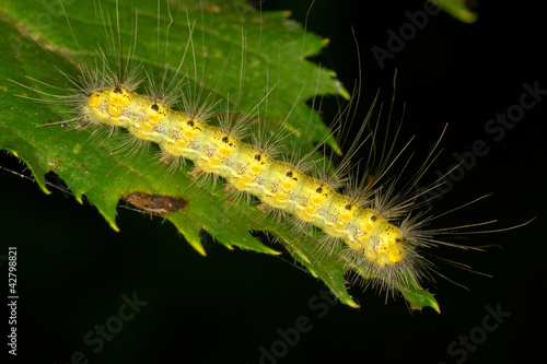 Naklejka premium yellow hairy caterpillar on a green leaf