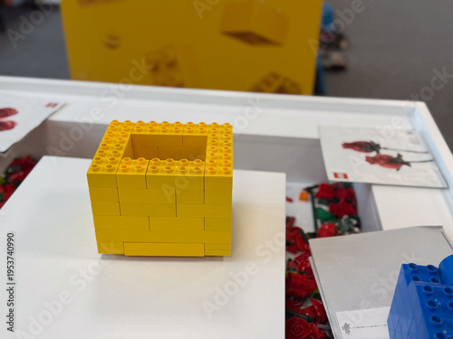 Fototapeta premium Yellow hollow lego cube on display