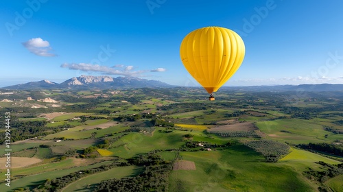 © Argan, Obraz premium Yellow Hot Air Balloon Flying Over Green Fields with Mountain Backdrop