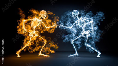 Fototapeta premium Yellow hot and blue cold human skeletons dancing or fighting on black background