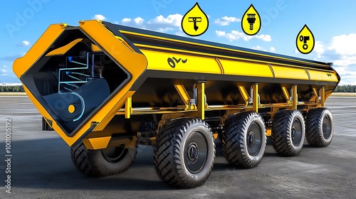 © RAKSIWAH, Naklejka premium Yellow Industrial Tanker Truck With Six Wheels And Water Drop Icon Symbols