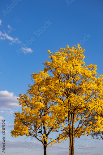 Naklejka premium Yellow ipe in bloom. Typical brazilian tree. One of the most beautiful and delicate flowers in Brazil. Nature show.