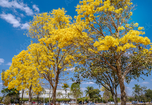 Naklejka premium Yellow ipe tree, Tabebuia chrysantha, ipe-amarelo is National Tree in Brazil, is a native tree of the intertropical broadleaf deciduous forests of South America. Brasilia, Brazil. September of 2019.