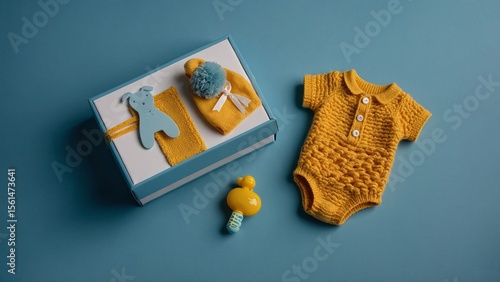 © Jaweria, Obraz premium Yellow Knitted Baby Romper with Gift and Pacifier on Blue Background