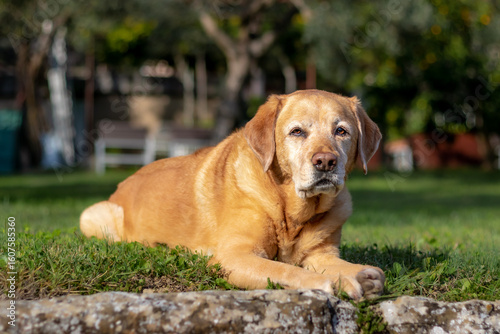© Pikalonca, Fototapeta premium Yellow labrador laying in the grass