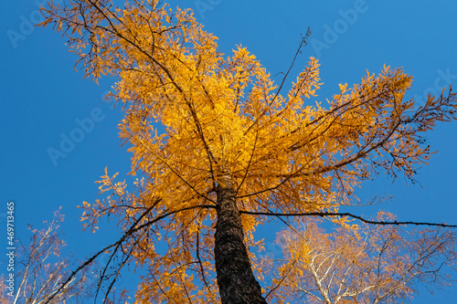 Obraz premium Yellow larch in the autumn fox, bottom view. Blue sky, no people