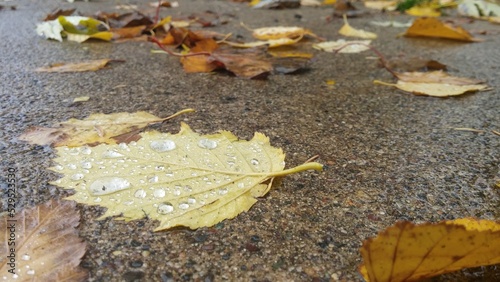 Obraz premium Yellow leaf with rain drops