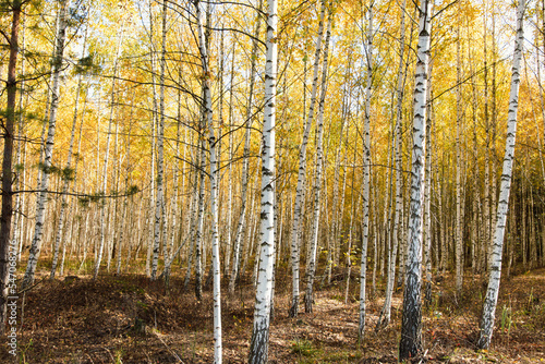 Fototapeta premium Yellow leaves on a birch tree in autumn.