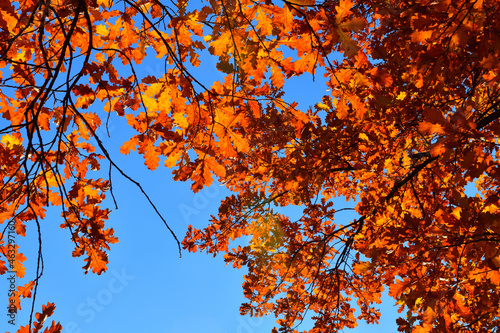 Fototapeta premium Yellow leaves on an oak branch in sunlight on a blue sky