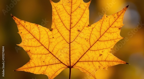 © Cahyani, Obraz premium Yellow Maple Leaf Close-up Showing Veins and Textures Against Blurred Background