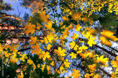 © sergofan2015, Fototapeta premium Yellow maple leaves in autumn sunny morning on blue sky background.