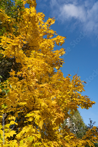 Fototapeta premium Yellow maple leaves on the blue sky.