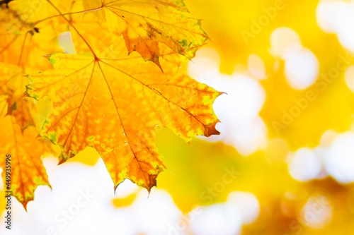 Fototapeta premium Yellow maple. Maple leaves on a blurred background. Autumn background. Copy...